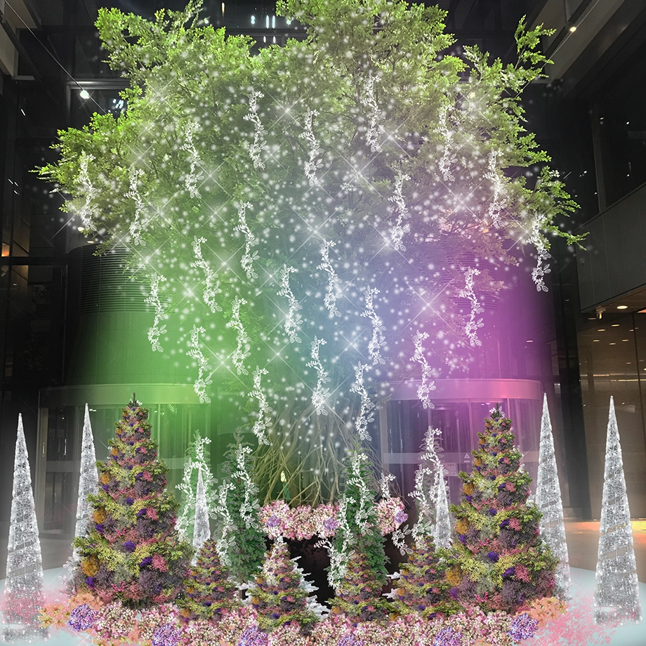 今年は、「冬の森に咲く花」をイメージした、生命力あふれるツリーが登場します。スノーホワイトを基調に、静謐な冬の森の情景を描きながら、その中に春の芽吹きを表現。装飾には、「スターチス」などのドライフラワーをメインに使用し、色彩豊かな天然素材で美しく装飾します。繊細なオーナメントが、冬から春へと移り変わる華やかな森の空間を創り出します。新宿都心のオフィスビルの中で、自然のぬくもりを感じる有機的な空間を是非お楽しみください。
