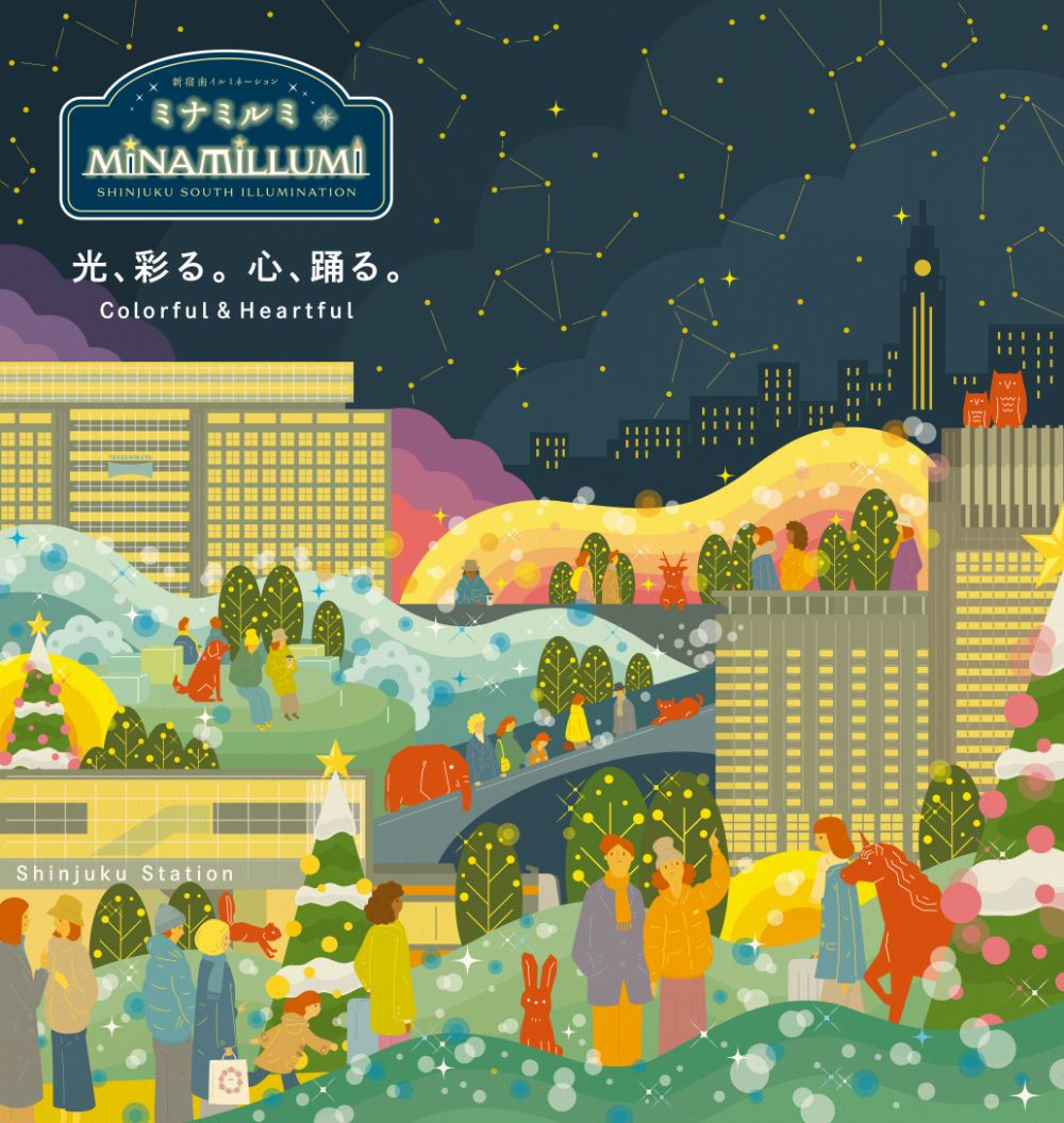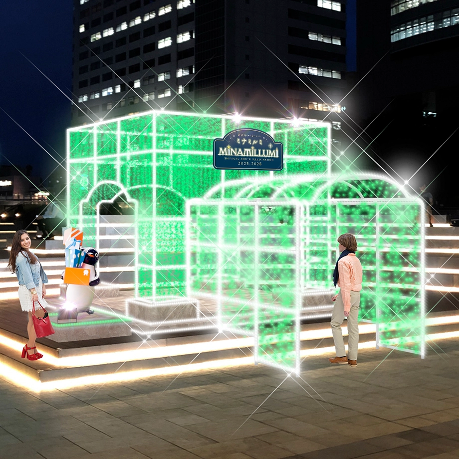 2025年3月に140周年を迎えたJR新宿駅。新南改札外のSuicaのペンギン広場では、新宿ミナミルミの「ウェルカムゲート」を設置します。明るく優しい色味のグリーンを基調とした通り抜け可能な大型ゲートをご用意して、新宿ミナミルミの華やかなイルミネーションの世界に誘い込みます。昼夜お楽しみいただける「SHINJUKU」の文字オブジェをSuicaのペンギンと組み合わせ、思い出のフォトスポットとして皆さまをお待ちしております。