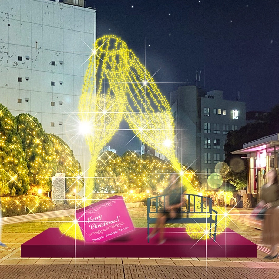 きらめくゴールドが降り注ぎ、新宿サザンテラスの豊かな樹木を幻想的な光で彩ります。広場には大きなシャンパングラスのオブジェが登場し、特別なホリデーに祝福の乾杯を演出します。静かで上質な時間とともに、幻想的な光に包まれる空間で安らぎをお楽しみいただけます。